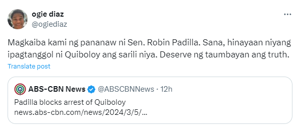 Ayon kasi kay Ogie, sana raw ay hinayaan ni Robin na ipagtanggol ni Quiboloy ang kanyang sarili: "Magkaiba kami ng pananaw ni Sen. Robin Padilla. Sana, hinayaan niyang ipagtanggol ni Quiboloy ang sarili niya"